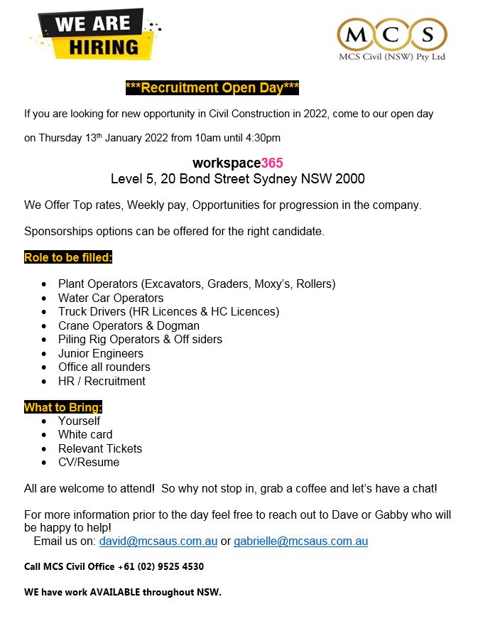 ***Recruitment Open Day*** 13th January 2022 10am to 4.30pm workspace365, Level 5, 20 Bond Street Sydney NSW 2000 Upload CV Please complete the form below to apply for this position First NameLast NameEmail* PhoneUpload File